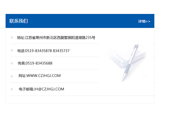 傳真:0519-83435688    郵編:213135    網址:WWW.czjhgj_com.anwatech.com    電子郵箱:JH@czjhgj_com.anwatech.com